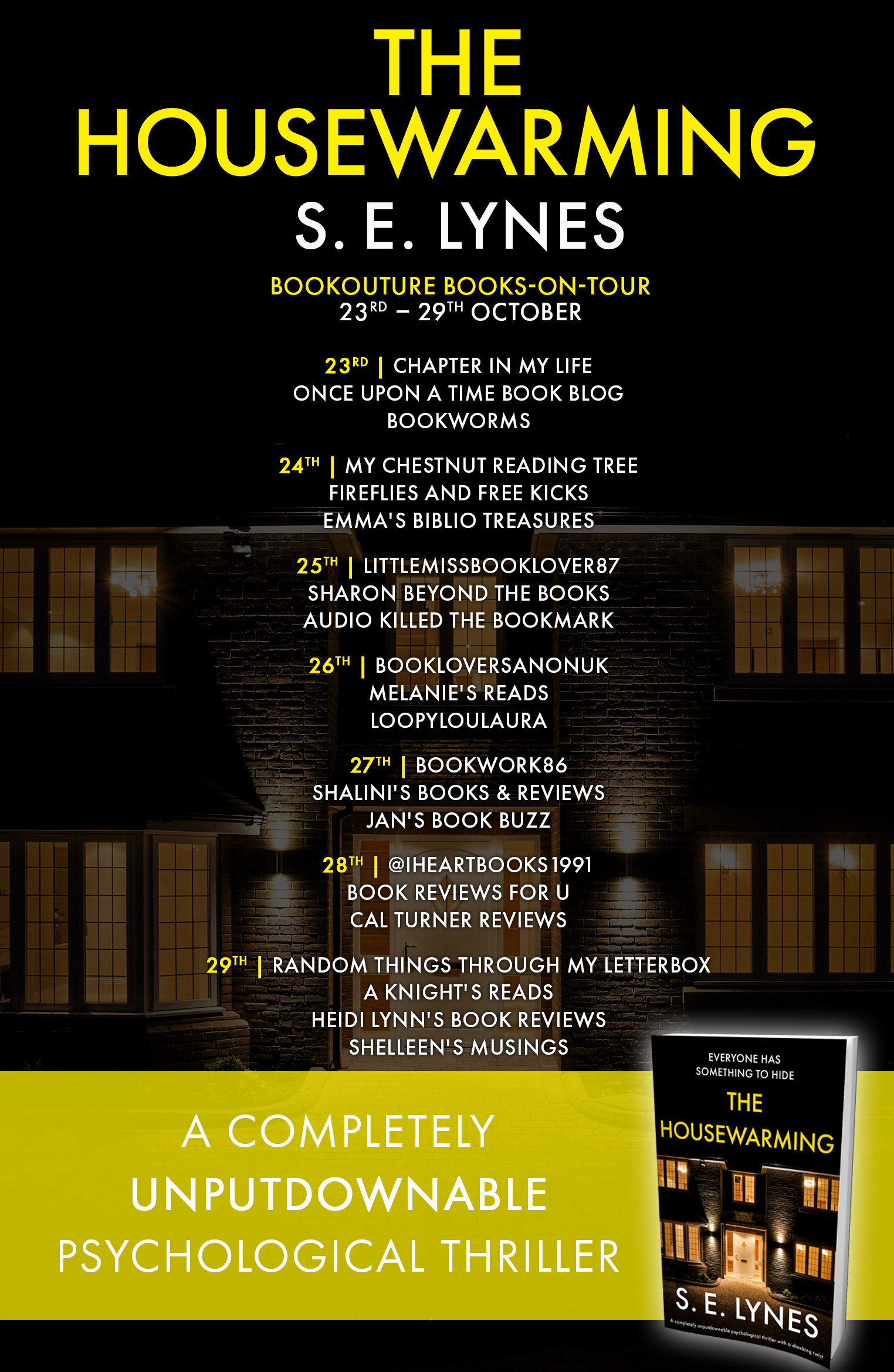 Former BBC Producer, S.E. Lynes is the Amazon best selling author of ‘intelligent and haunting’, ‘beautifully written’ psychological thrillers, VALENTINA, MOTHER, THE PACT, THE PROPOSAL, THE WOMEN, THE LIES WE HIDE, CAN YOU SEE HER? and her latest novel, THE HOUSEWARMING, available for order NOW.